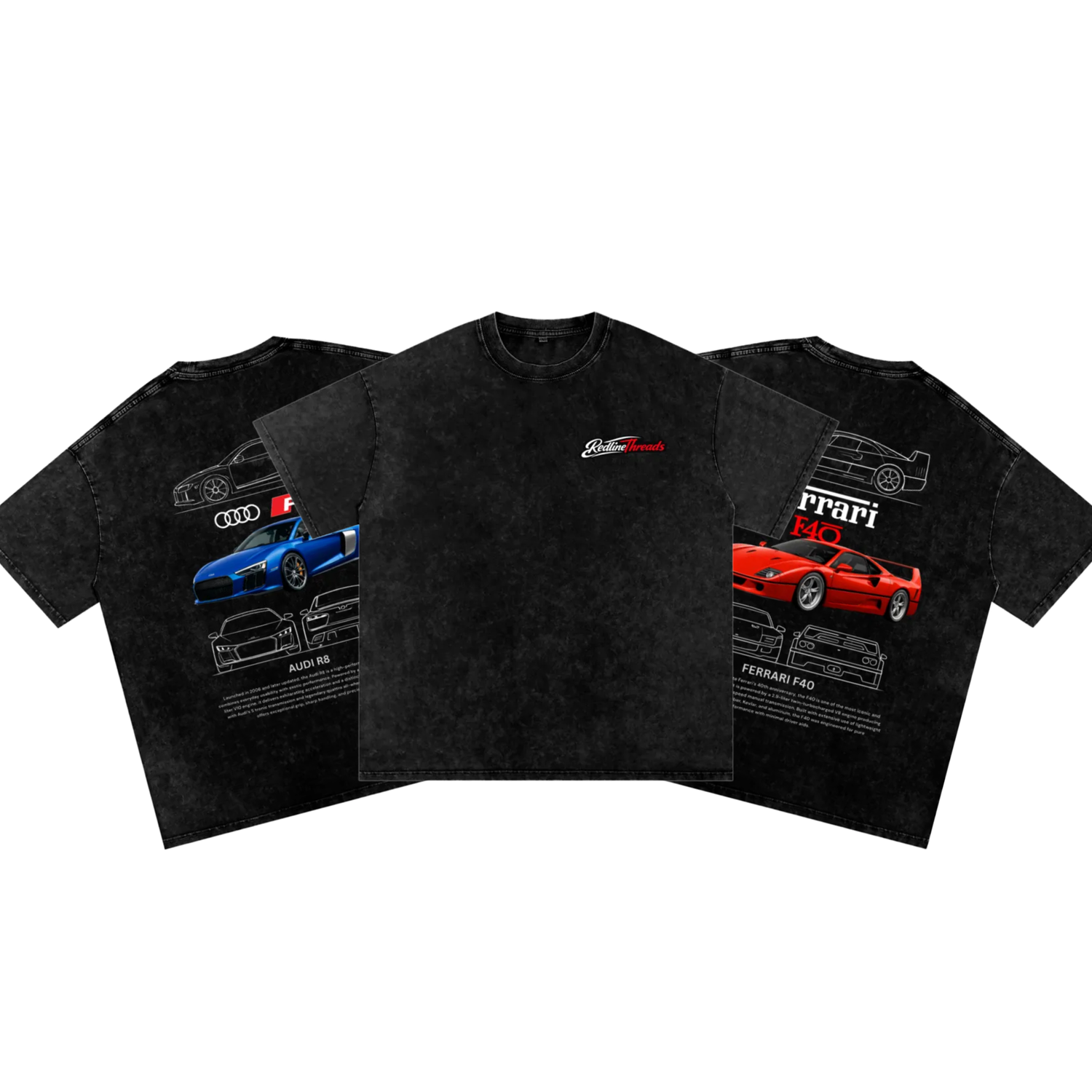 Our Snow Washed Oversized T-Shirts combine iconic automotive design with premium streetwear quality. Each piece features a detailed, high-definition back graphic inspired by legendary performance cars — showcasing multi-angle layouts, blueprint-style outlines, and bold centerpiece artwork that captures the spirit of speed and engineering excellence.